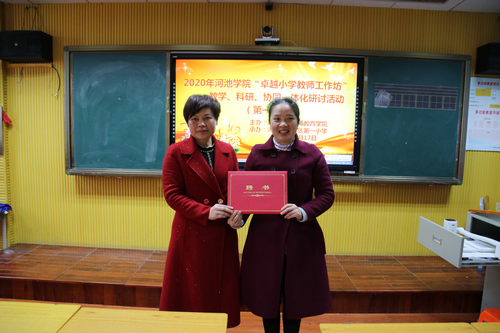宜州区一小、宜州区实验小学校长,卓越小学教师工作坊坊主石秋香、黄素慧分别致辞;工作坊成员宜州区一小黄建新老师、宜州区实验小学韦泰峰老师分别展示示范课,我院17级小学教育专业学生韦俏慧、李婉怡分别展示了汇报课;教师教育学院韦芳教授做题为“教育课题申报与论文写作”专题讲座。最后教师教育学院院长邓琴讲话并为兼职教师颁发聘书。