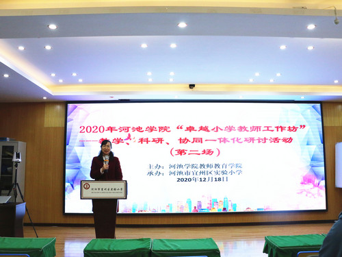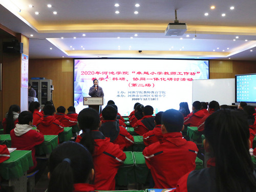 12月17日至18日,由教师教育学院主办的河池学院2020年“卓越小学教师工作坊”——教学、科研、协同一体化研讨活动分别在宜州区第一小学、宜州区实验小学隆重举行。教师教育学院党委书记李新富、院长邓琴、副院长覃奠仁、副书记王爱林、副院长谭静,初等教育系、教育学心理学教研部教师,卓越小学教师工作坊导师团队、卓越小学教师工作坊团队成员、河池学院实习生到场参加了活动。