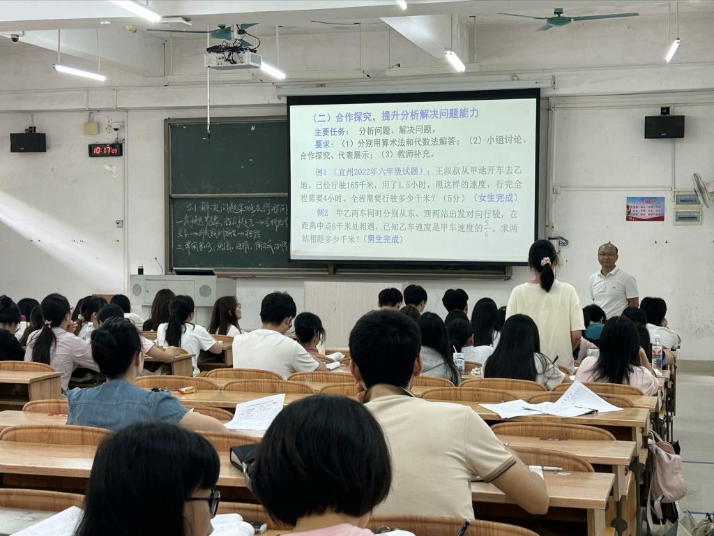 5月16日上午第三节,樊仲光副教授在弘毅楼2-105教室为小数23班的学生开展了课题为《解决问题的基本策略与行程问题研究》的教学活动,教学围绕小学数学解决问题建模的基本步骤、具体策略以及典型问题-行程问题的分析解决的基本方法等内容展开。课堂上,樊仲光副教授结合小学数学教学实际,用清晰的教学思路、充实的教学内容、娴熟的组织能力展示了自己的教学风采,充分调动学生学习的积极主动性,营造了活跃的课堂氛围,教学效果显著,赢得了在场教师的一致好评。
