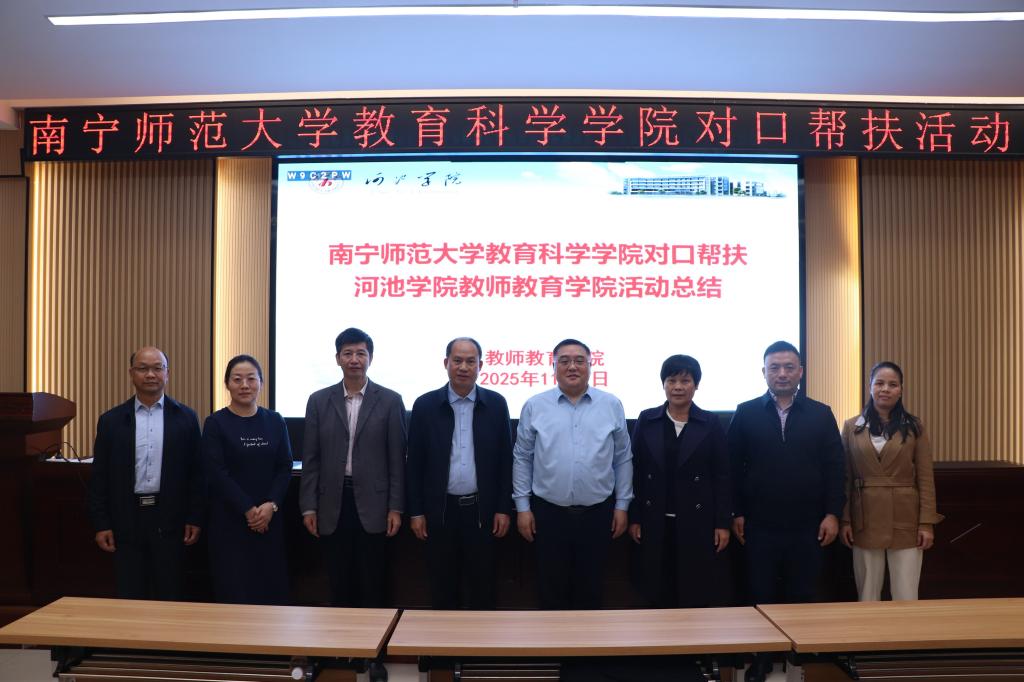 为深入贯彻落实广西普通本科高校对口支援工作精神,推动师范专业认证整改与本科教育教学审核评估工作走深走实,2025年10月31日至11月1日,南宁师范大学教育科学学院院长李强率领专家团队一行3人,赴河池学院教师教育学院开展为期两天的对口帮扶系列活动。活动包括座谈会、分组指导、专题讲座等环节,内容涵盖专业认证、学科建设、教学成果奖培育、科研项目申报、脑电实验室建设等多个方面。