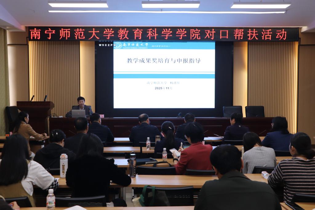 南宁师范大学教育科学学院院长李强在讲话中表示,本次帮扶是落实两校合作机制的具体行动,教科院高度重视,派出在专业认证、学科建设、科研申报、心理学实验等领域具有丰富经验的专家团队,“拿出了压箱底的力量”。他希望通过此次交流,进一步深化两院在师资培养、科研合作、硕士点建设等方面的实质性合作,实现“双向奔赴、共同成长”。