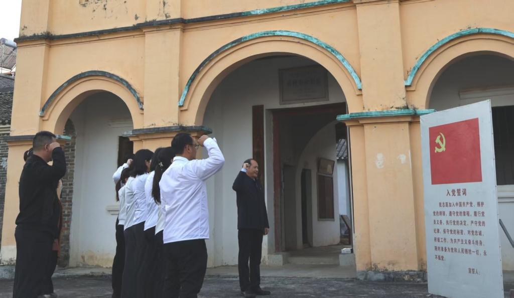 在上林县南陔革命旧址,通过上林县巷贤镇卢柱村党支部李峰秀副书记的详细讲述以及图文档案、实物展品和场景复原,让大家了解到这里曾是广西早期党组织秘密开展革命活动的重要据点,是大革命时期工农运动的重要策源地。同时,还了解到韦拔群、雷经天等广西重要革命先驱曾到上林领导农民运动、建立革命根据地的历史事迹。通过现场教学,大家沉浸于烽火硝烟岁月革命先辈开创的伟大事业与熔铸的红色精神的海洋里。在南陔革命旧址大门前,学院党委组织举行了庄严的重温入党誓词仪式,铿锵誓言在红色热土上回荡,这既是党员初心的回望、感悟信仰的力量,也是在思想的洗礼中凝聚力量再出发---不负革命先辈为中华民族闯出的光明之路,不负吾辈肩负民族伟大复兴的时代责任。