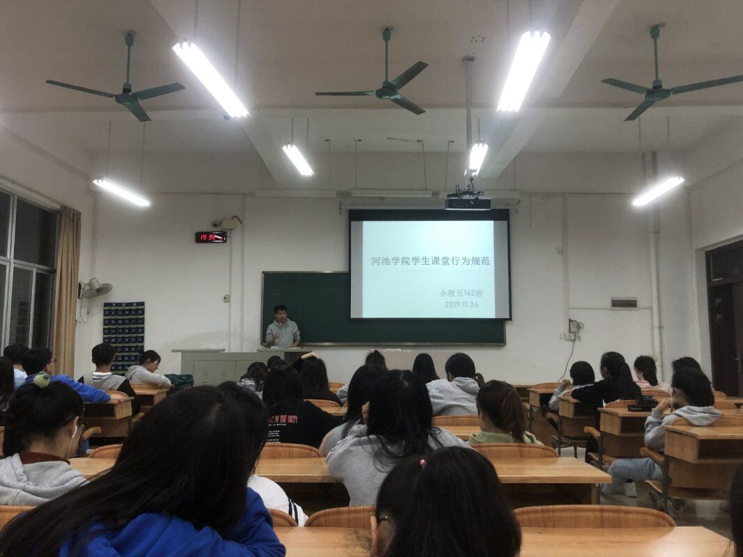 在班会上,各班班主任带领同学们学习《河池学院课堂教学管理办法》,并结合我院实际,就课堂上有可能出现的不良行为进行着重强调,他们表示作为一名大学生,应该遵纪守法,尊重老师,刻苦学习,具备学习的自觉性,行为的规范性和生活的自律性,在课堂上举止得体,言行文明,自觉将通讯工具、电子娱乐设备设置为静音或关闭状态,集中精力听课,积极参与课堂活动;班委需要发挥作用,率先垂范,成为课堂行为规范的模范,认真带领广大同学自觉遵守课堂行为规范。