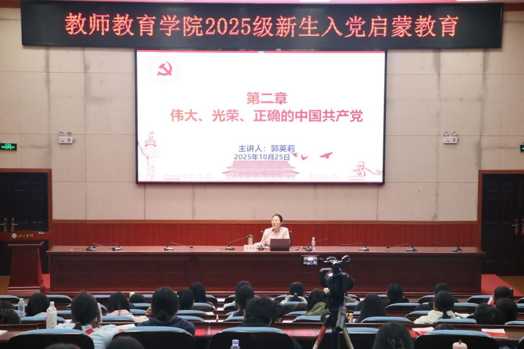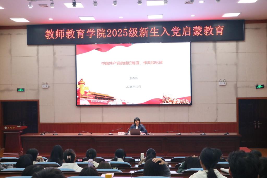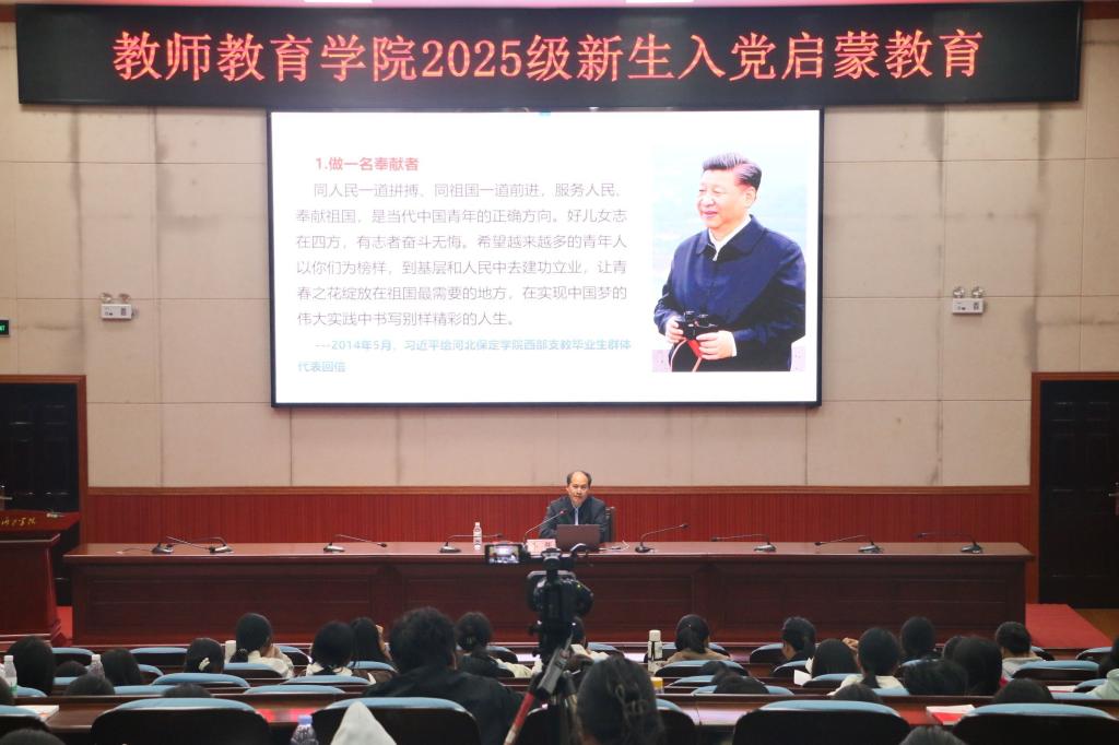 为深入学习宣传贯彻习近平新时代中国特色社会主义思想,切实加强青年学生理想信念教育,引导2025级新生端正入党动机,积极向党组织靠拢,践行“强国有我,请党放心”的青春誓言。10月25日上午,教师教育学院党委在东区弘毅楼1-205报告厅组织举行2025级新生入党启蒙教育开班仪式。学院党委书记、分管学生工作副书记、专职组织员、各学生党支部书记出席,本院2025级四年制本科全体新生参加培训活动。学院党委副书记、纪委书记郭英莉主持开班仪式。